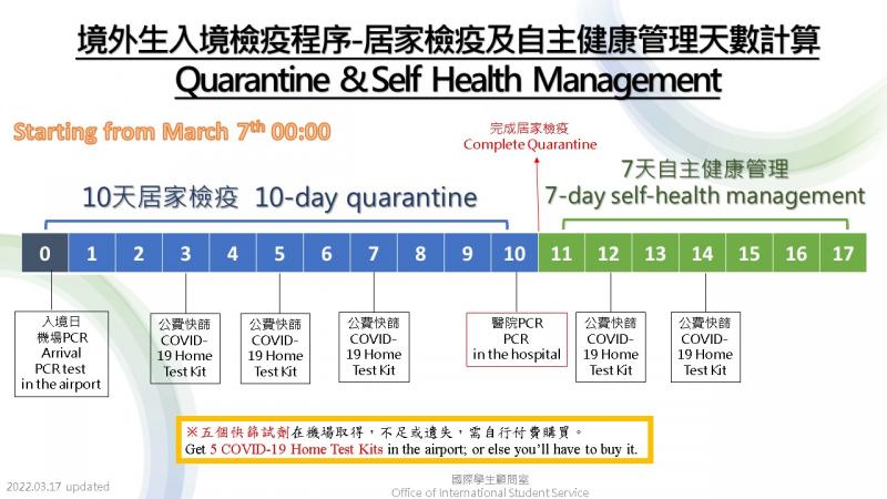 | February 15th , 2022 | Students arrive in Taiwan, checking in government-arranged quarantine facilities, or quarantine hotel reserved by yourself. |