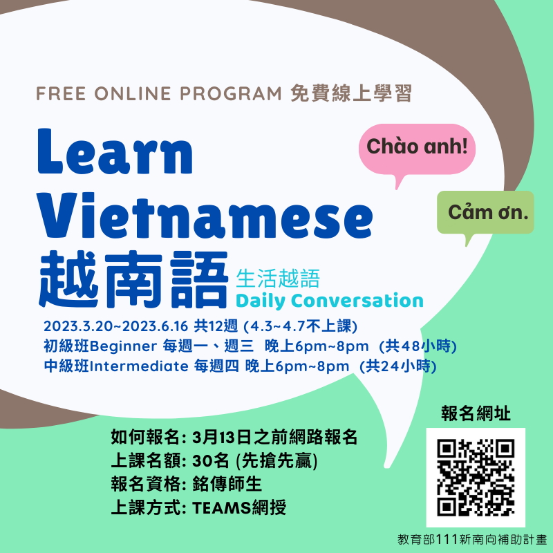 本校越南籍講師網授生活越語, 提供師生免費線上學習越南語, 培育國際移動人才目標, 期望學生能在未來職場中更具競爭力。